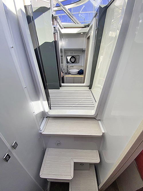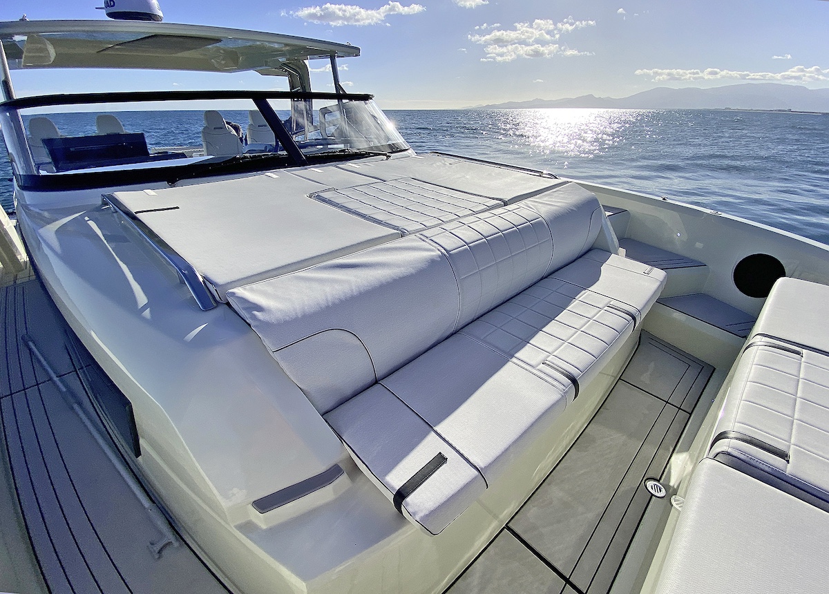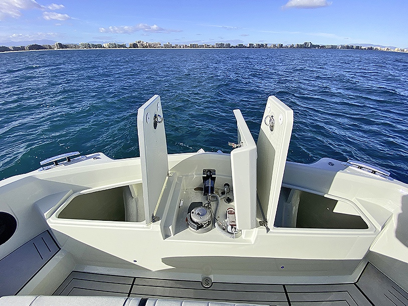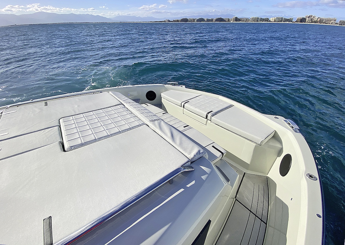 Naturalmente, y por razones obvias de seguridad, el acceso a la proa se realiza preferentemente por estribor. La cubierta de proa está cubierta por un amplio solárium a cuyos pies hay un asiento corrido, donde sentarse cuando se navega con buen tiempo. Ofrecido de serie con dos motores Mercury de 225 Hp, nuestro Yot 36 venía con la opción de dos Mercury Verado de 300 CV.