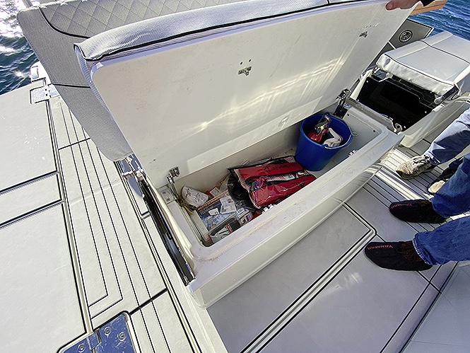 No falta espacio de almacenamiento en la bañera, pero los compartimentos laterales, ocultos en el suelo, son demasiado profundos y no están suficientemente bien dispuestos para resultar prácticos. Del mismo modo, las tapas situadas bajo cada uno de los cuatro asientos corridos no se mantienen abiertas por ellas mismas. Estos pequeños defectos de juventud deberían corregirse en futuros modelos, siendo el Yot 36 probado en Canet-en-Roussillon el número 1.