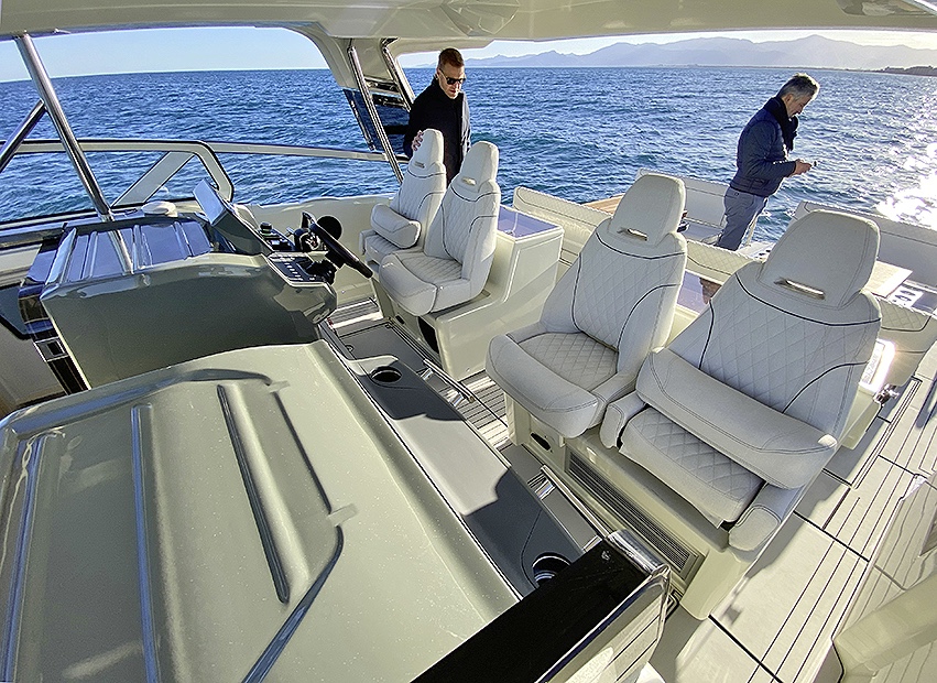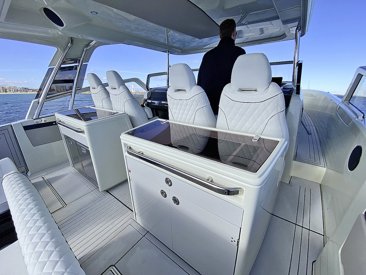 El puesto de gobierno, con sus cuatro asientos (dos a babor y dos a estribor), es uno de los grandes puntos fuertes del Yot. Con reposapiés, asientos abatibles, reposabrazos y sólidos pasamanos, todo está dispuesto para ofrecer a los pasajeros y al conductor comodidad y seguridad. Los ocupantes de estas cuatro plazas también están protegidos por un T-top a toda la manga y un parabrisas bastante eficaz.