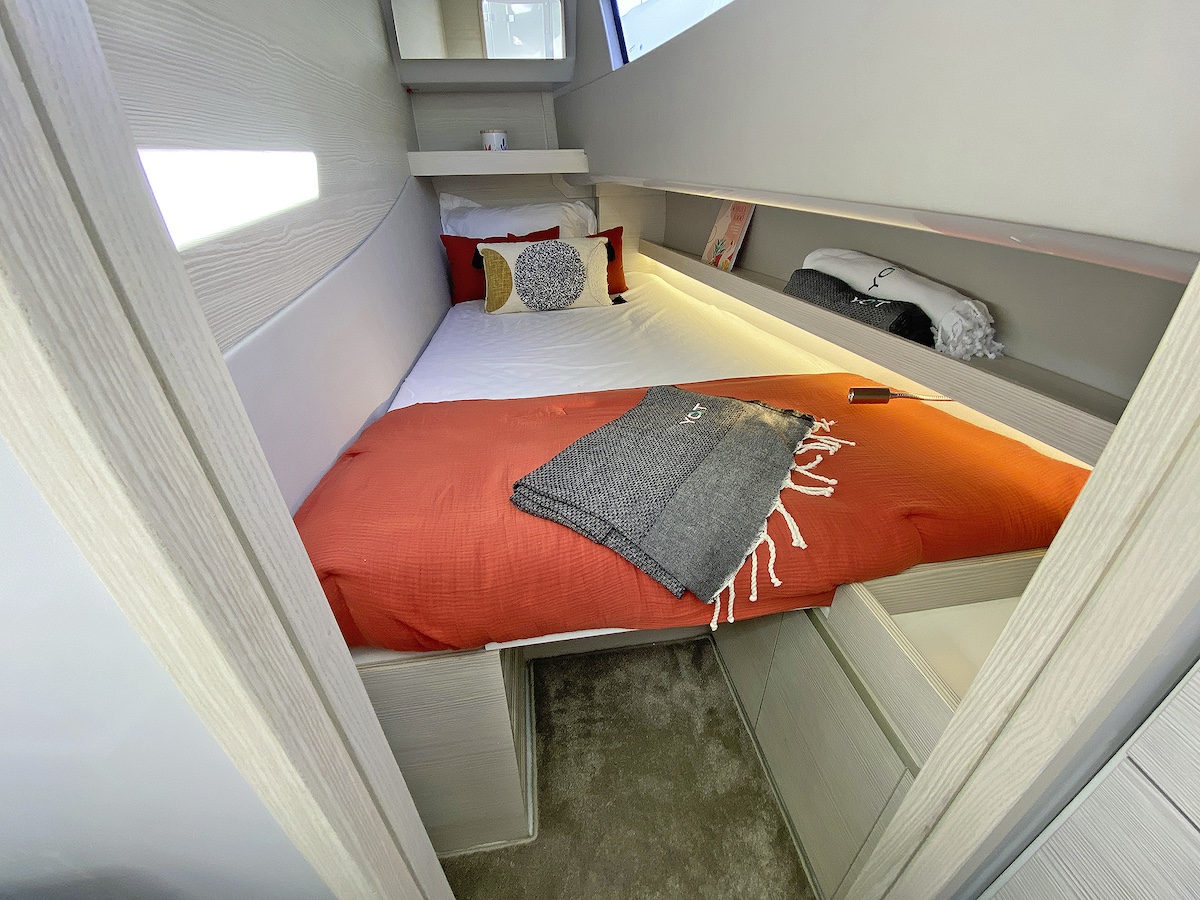 A proa, el camarote de babor, destinado al propietario, es más espacioso que el de estribor, con una gran cama doble de 1,92 x 1,43 metros y un mueble de almacenamiento.