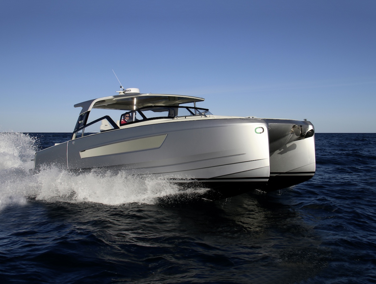 En su entrada en el mercado de las embarcaciones a motor, la marca YOT lanza un catamarán de 10 metros cuya carena combina la manga de un monocasco con las cualidades de un multicasco. ¡Un buen barco intermedio, en definitiva!