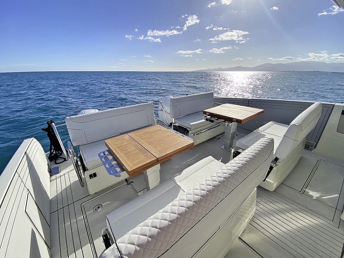 En la bañera, dos zonas de dinette y de estar independientes compuestas por dos bancos enfrentados y una mesa plegable están separadas por un pequeño pasillo central, pero se juntan en cuanto se despliegan los laterales de las mesas. Los respaldos reversibles y las mesas abatibles permiten crear diferentes distribuciones de cubierta: dos zonas de solárium, una zona de solárium y un salón, bancos orientados hacia popa o hacia proa… en resumen, esta bañera es muy modulable.