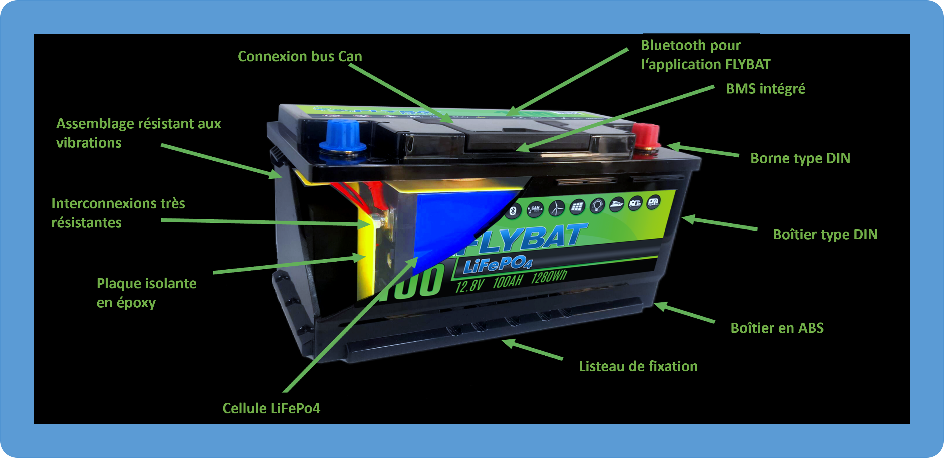 Todas las celdas que componen una batería de litio son químicamente inestables. Dado su alto contenido energético, es necesario un componente capaz de controlar y estabilizar la batería. Este elemento, denominado BMS (Battery Managing System), consiste en una tarjeta electrónica situada en la parte superior de la batería. Debe ser fiable durante toda la vida útil de la batería y adaptarse a los sistemas de recarga externos (cargador, alternador, solar, etc.). Los fabricantes de cargadores son conscientes de ello y ofrecen cargadores adaptados que, en algunos modelos, pueden interactuar con las baterías a través de un bus (red CAN). Este bus permite conectar y comunicar entre sí una amplia gama de equipos. Este sistema, que se encuentra en las grandes instalaciones, no es obligatorio. La recarga puede realizarse a partir de un cargador específico con una salida adaptada a las baterías LFP.