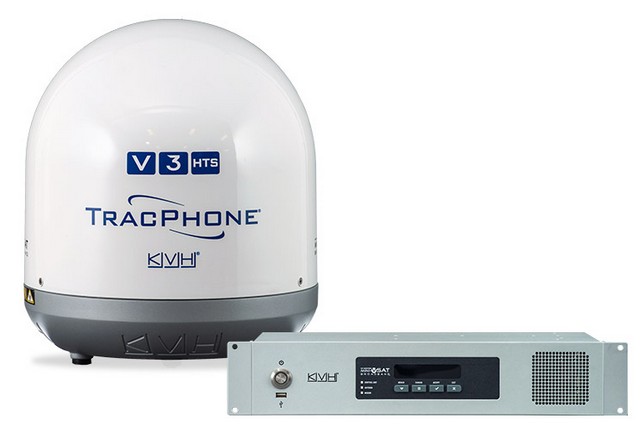 Para Internet de alta velocidad a bordo, KVH completa su rango con el TracPhone VSAT V3HTS. Con una parábola de solo 37 cm y un peso de 11,3 kg, este Track-Phone permite obtener una tasa de bits de subida de hasta 2 Mbps y de bajada de hasta 5 Mbps.