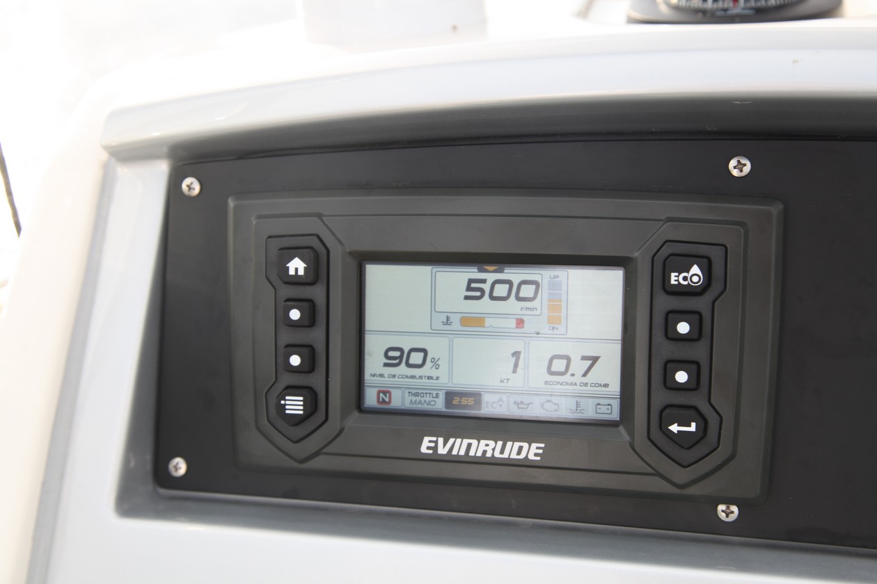 Es un motor idóneo para esloras entre 6 y 7 metros, que disfruta de todas las ventajas de los E-Tec G2, con dirección electrohidráulica iSteer, muy precisa y eficaz respuesta, basada en un diseño compacto que deja despejada la popa; que puede emplear palancas electrónicas y las pantallas de 4,3 y 3,5 pulgadas con toda la información sobre el motor y la navegación, entre otras consumo, revoluciones, distintas alarmas y un largo etcétera que se puede configurar al gusto del usuario, aunque exige cierta práctica, tal como pudimos comprobar.