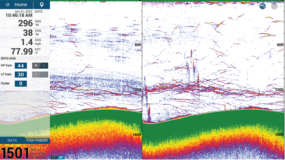 La DFF3-UHD proporciona una increíble potencia de salida de 2kW o 3kW a un transductor de banda ancha compatible, transmitiendo a través de un espectro de frecuencias para garantizar que los resultados en la pantalla sean nítidos y claros en cualquier rango. La DFF3-UHD recopila datos más extensos y de mayor calidad que las sondas tradicionales de alta potencia y doble frecuencia, lo que ofrece ventajas significativas en cuanto a claridad de la señal y definición del objetivo. Esto ayuda a encontrar más especies objetivo y peces de cebo, incluso cuando están muy agrupados o cerca del fondo marino. Con cada pulsación, La DFF3-UHD transmite y recibe ecos a través de una combinación de rangos de baja, media o alta frecuencia de 25 kHz a 242 kHz, mostrando detalles impresionantes de bancos de peces y objetivos individuales prácticamente en cualquier lugar de la columna de agua.