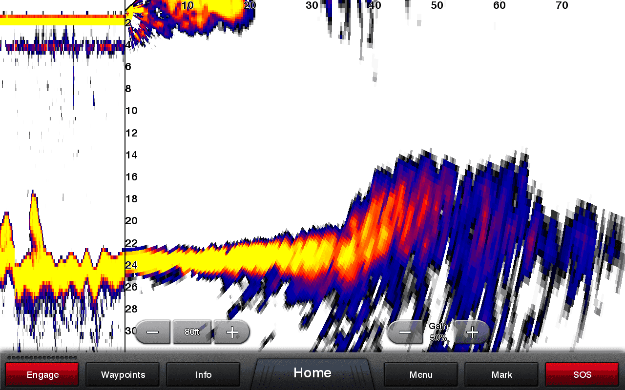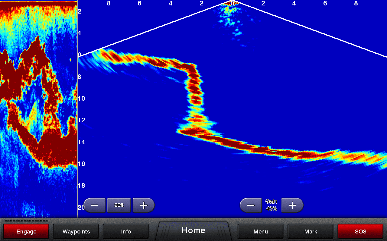 LiveVü desde abajo ofrece las imágenes de sonda en movimiento por debajo del barco. El pescador puede ver tanto el cebo pequeño como los peces que nadan alrededor, pudiendo identificar la distancia y la profundidad.