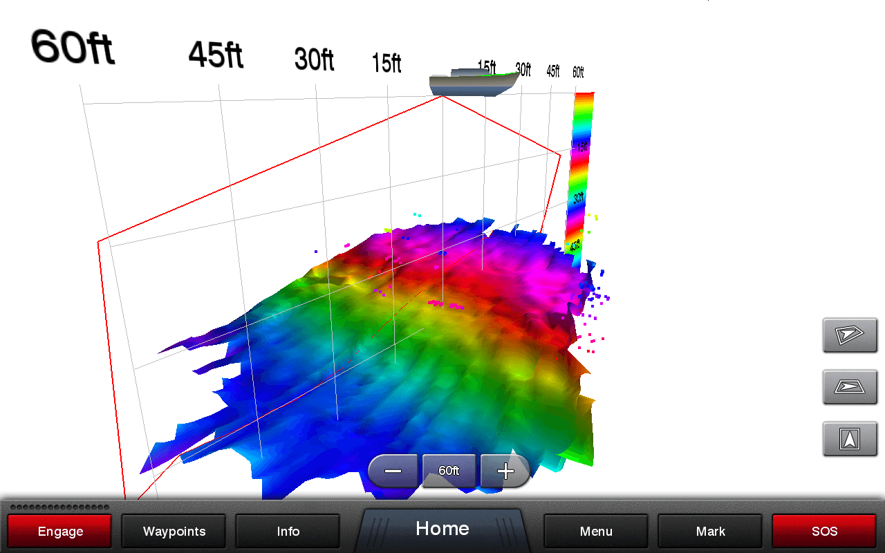 RealVü 3D desde abajo escanea digitalmente el área por debajo de la embarcación de adelante hacia atrás y de lado a lado, creando así una vista completa en 3D de todo lo que está por debajo del barco. Muestra el historial de un sólo barrido, con los cambios en el contorno del fondo, los peces, la estructura…