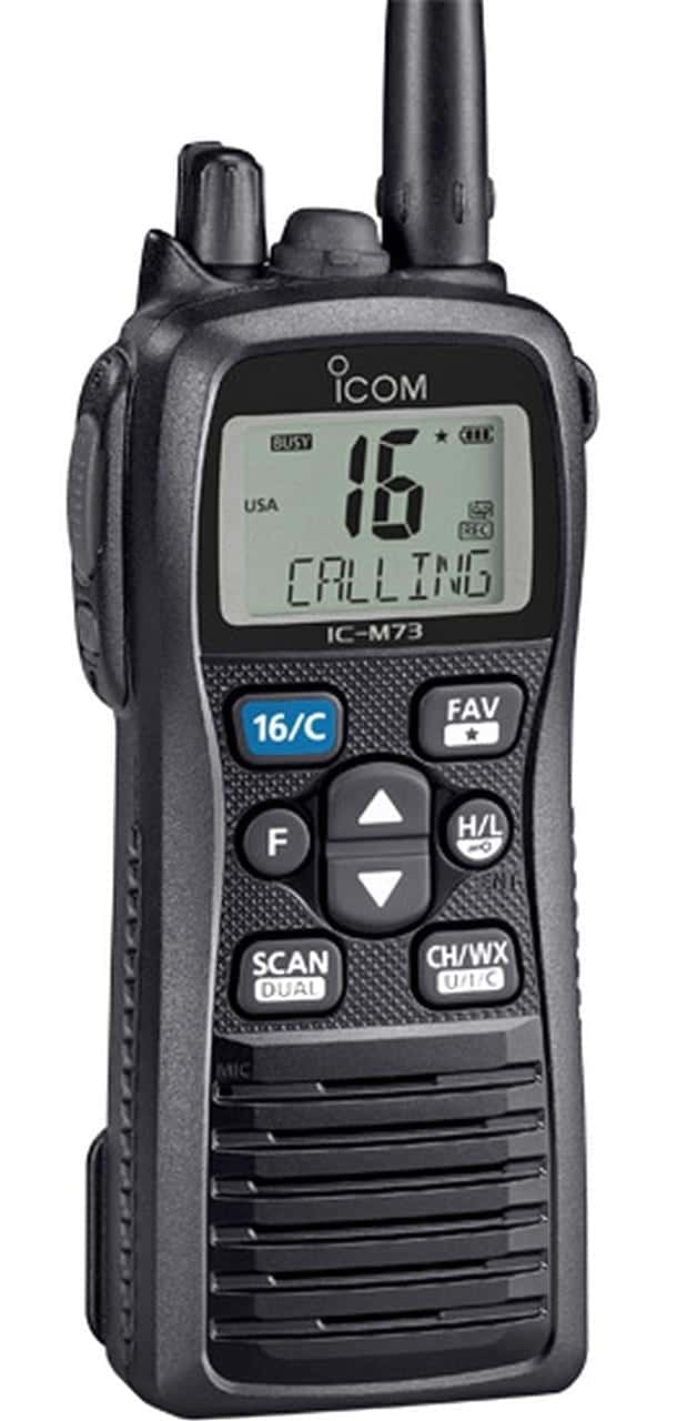 Por su parte, el Icom IC-M73 es un VHF portátil es un equipo estanco que cumple la normativa IPX8, y destaca por sus compacta dimensiones, por lo que es muy manejable. Integra un nuevo cancelador de ruido y dispone de grabación de la última llamada de voz por espacio de un minuto. Esta radio incorpora la última tecnología de la firma Icom con el cancelador activo de ruido bidireccional. Esto permite reducir hasta un 90% el ruido de fondo, y mejora tanto la voz transmitida como la llamada entrante.