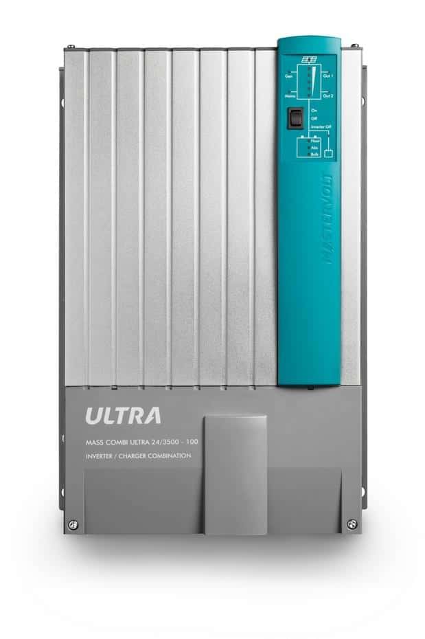 En corriente continua, el Mass Combi Ultra cuenta con entrada solar y una segunda salida independiente así como de un eficiente regulador de carga solar MPPT (Maximum Power Point Tracker) integrado que optimiza digitalmente la conversión del voltaje CC originado en los paneles solares o generadores eólicos en el adecuado para las baterías, garantizando así el máximo aprovechamiento de la energía solar para cargar las baterías. El voltaje CC puro asegura un funcionamiento sin interferencias de las aplicaciones CC, al tiempo que aumenta la vida útil de la batería. La segunda salida independiente puede cargar baterías con el mismo voltaje que la batería de servicio, pero también una batería de arranque de 12V o la batería del sistema de propulsión si la batería de servicio es de 24V, una función muy útil que simplifica la instalación y reduce costes al usuario final. La serie Mass Combi Ultra está formada por las referencias 12/3000-150, 24/3500-100 y 48/3500-50, con capacidades pico de 6.000 W y 7.000 W, corrientes de carga de 150/100/50 amperios, y potencias de 3.000 y 3.500 W respectivamente.