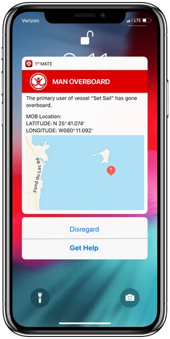 Si el patrón se encuentra solo y el sistema detecta que ha caído al agua, 1st Mate enviará un mensaje de socorro a los contactos incluidos previamente en la aplicación. Este mensaje de socorro incluye ubicación GPS y hora del aviso de hombre al agua. Esta función también es útil en casos en que el patrón caiga por la borda y aunque no esté solo, por cualquier motivo, los pasajeros no puedan gobernar el barco hasta el patrón o no puedan subirlo a bordo.