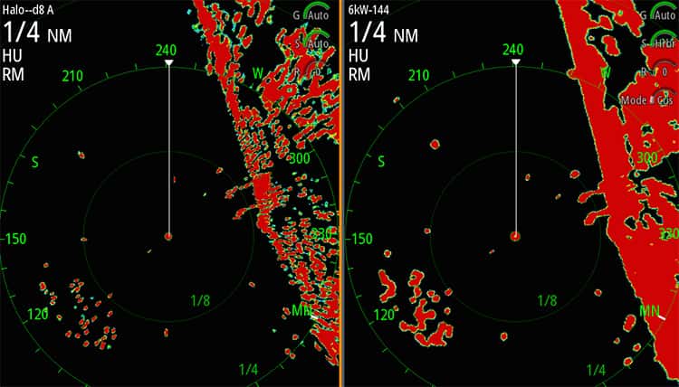 El Radar Halo de Simrad combina las ventajas del Radar Broadband con las de los sistemas de pulsos tradicionales, aportando una mayor visibilidad y un alcance inigualable: Proporciona un alcance mínimo de 6 metros (20 pies), cubriendo así los puntos ciegos de los radares de pulsos a los que solo podía llegar el Radar Broadband, a la vez que ofrece un alcance excepcional de 72 millas náuticas.