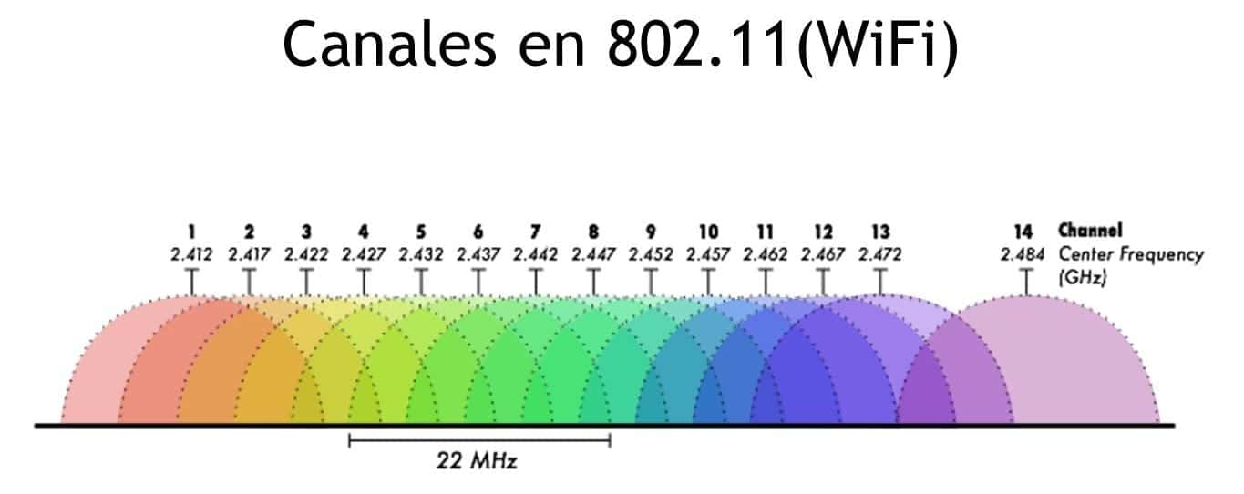 El éxito del wifi ha hecho que se masifique en muchas zonas, coincidiendo muchos puntos de acceso en la misma zona de emisión, provocando numerosos conflictos de frecuencias. La conectividad wifi en la frecuencia de 2,4Ghz trabaja con 13 “canales”, siendo teóricamente los más bajos los que deberían dar más alcance. Con este gráfico podemos ver su distribución y solapamiento.