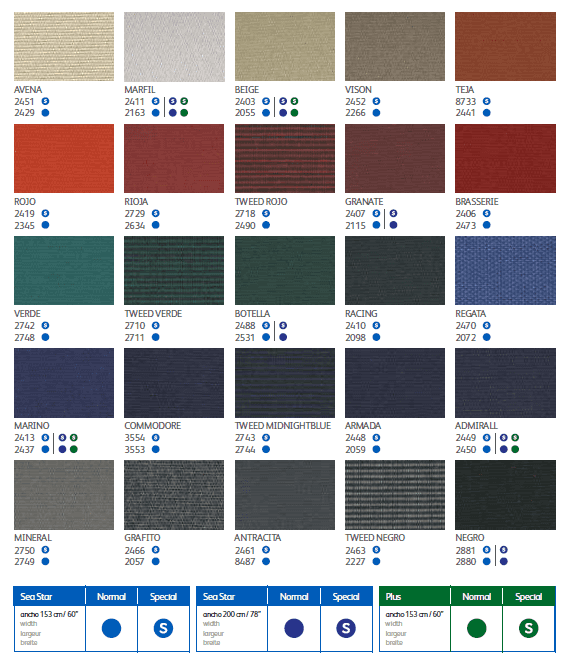 Sea Star es la colección de tejidos acrílicos de alta gama que ofrecen el más alto rendimiento en múltiples aplicaciones en el sector náutico. Sus excelentes cualidades: larga vida, levada resistencia frente a los rayos UV, permeabilidad al aire, impermeabilidad al agua, anti moho, ligereza y fácil mantenimiento. Todo ello, unido a la fibra acrílica Masacril tintada en masa, lo convierten en el tejido por excelencia, sin haber sido superado desde hace más de veinte años.