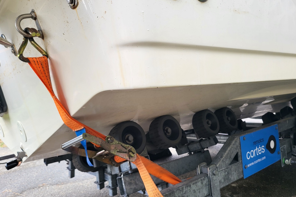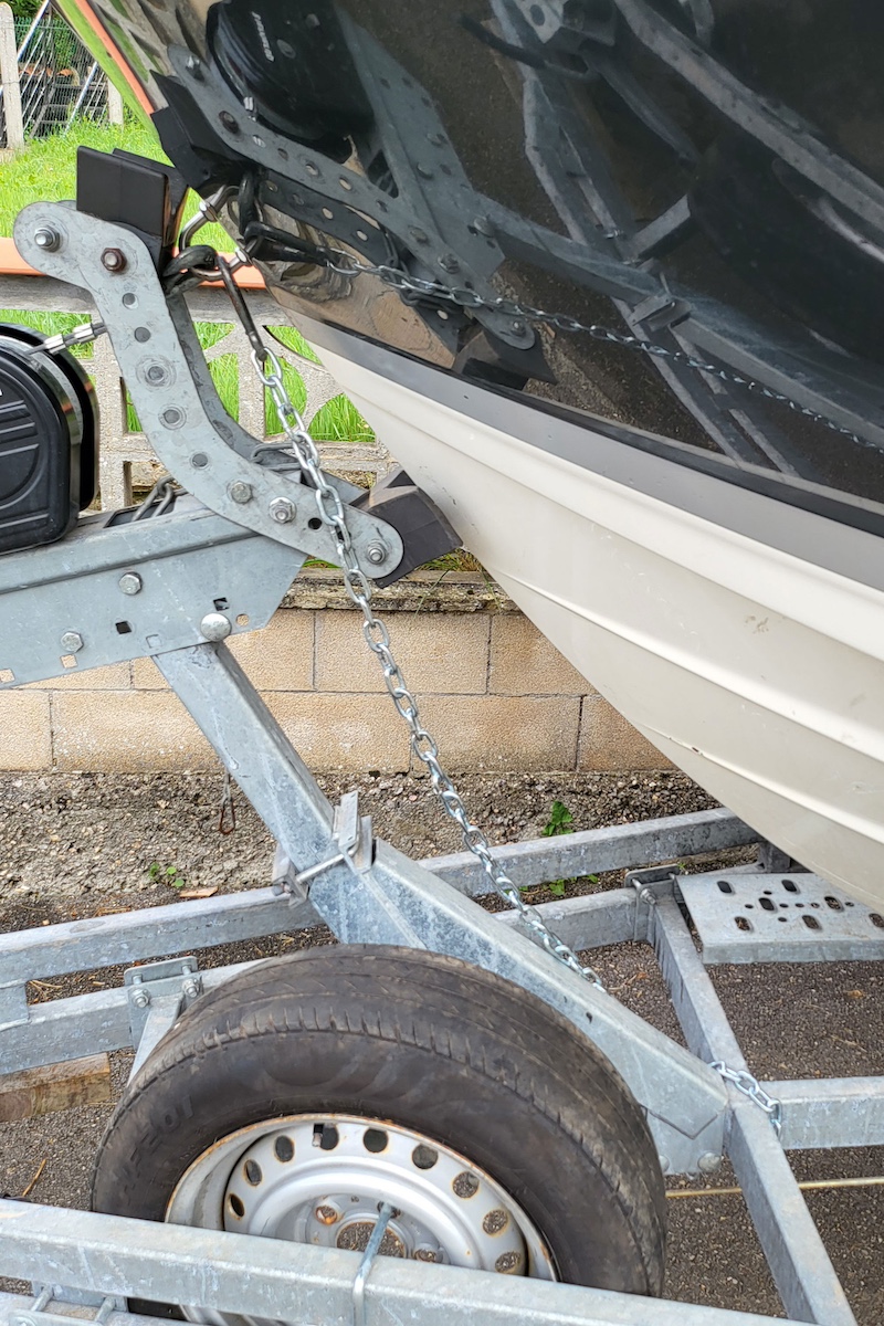Esa cadena, además, es la que uso como medida extra de seguridad cuando tengo que subir el barco por la rampa de botadura en ese preciso momento en que solo está sustentado por el cable y el gancho del winche (antes de sacar el remolque del agua y poder poner las cinchas en el espejo de popa). En ese preciso y delicado momento este barco de 2.500 kg de peso apoyado sobre rodillos solo está sujeto a la torreta del remolque por el cable del winche… así que si al subir la rampa diéramos un tirón y se rompiera el cable se nos iría el barco hacia atrás hasta golpearse con el suelo… (eso como poco). Por eso me gusta saber que tengo una segunda medida de seguridad, útil durante el transporte por carretera y también durante la maniobra de botadura.