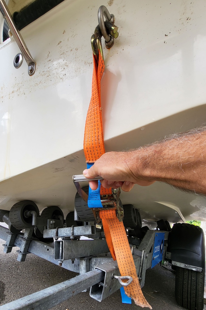 Las cinchas de carraca son correas de mayor o menor capacidad de aguante que nos permiten afianzar el espejo de popa de la embarcación al remolque, de tal manera que podamos evitar que la embarcación se levante y desplace en un badén o bache acusado y, sobre todo, para impedir que el barco resbale por los rodillos hacia atrás. Estas cinchas junto con el cable del winche y la cadena de seguridad evitan que el barco “ruede” sobre los rodillos hacia atrás y hacia delante durante la marcha. Son las responsables de evitar el vaivén.