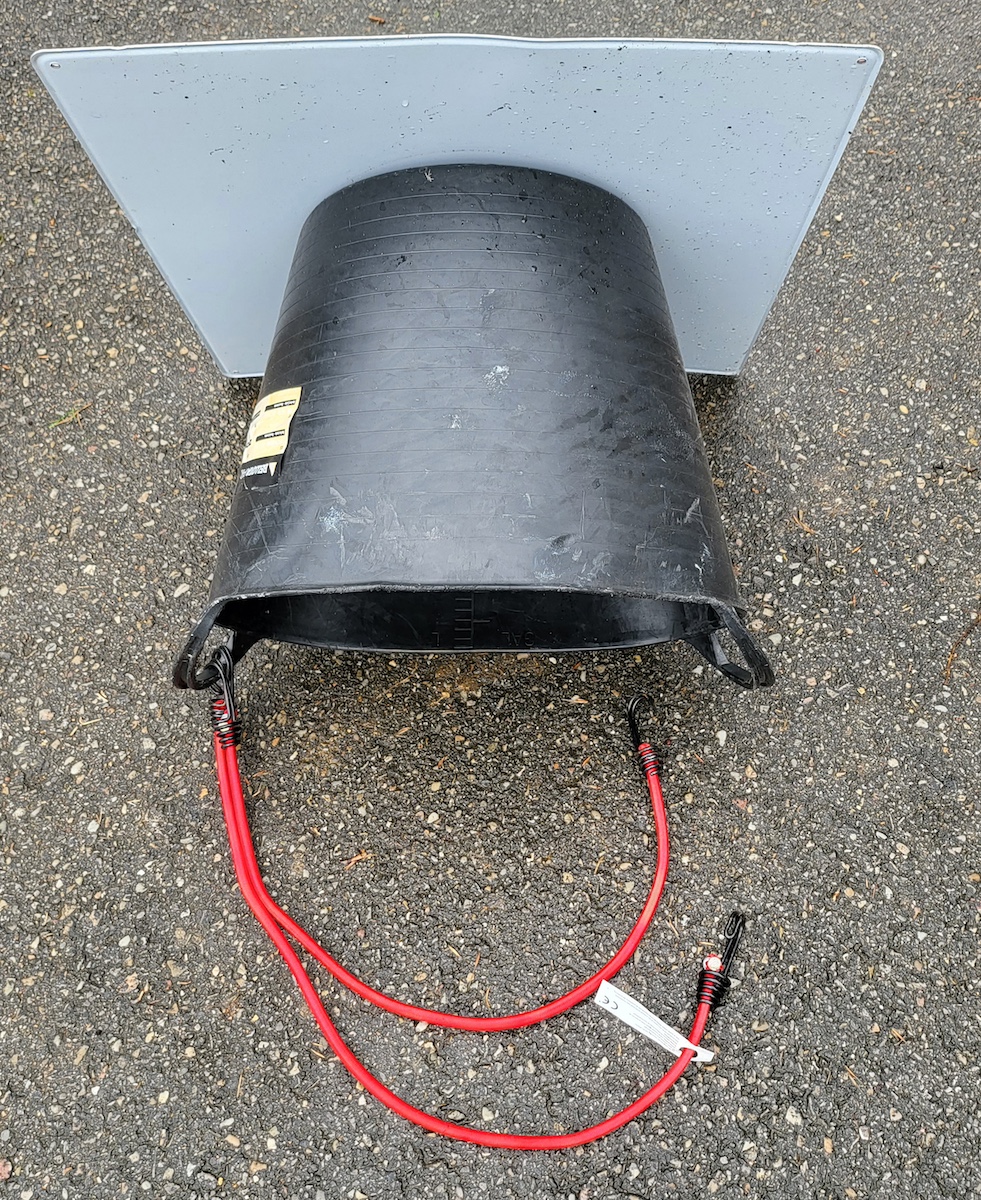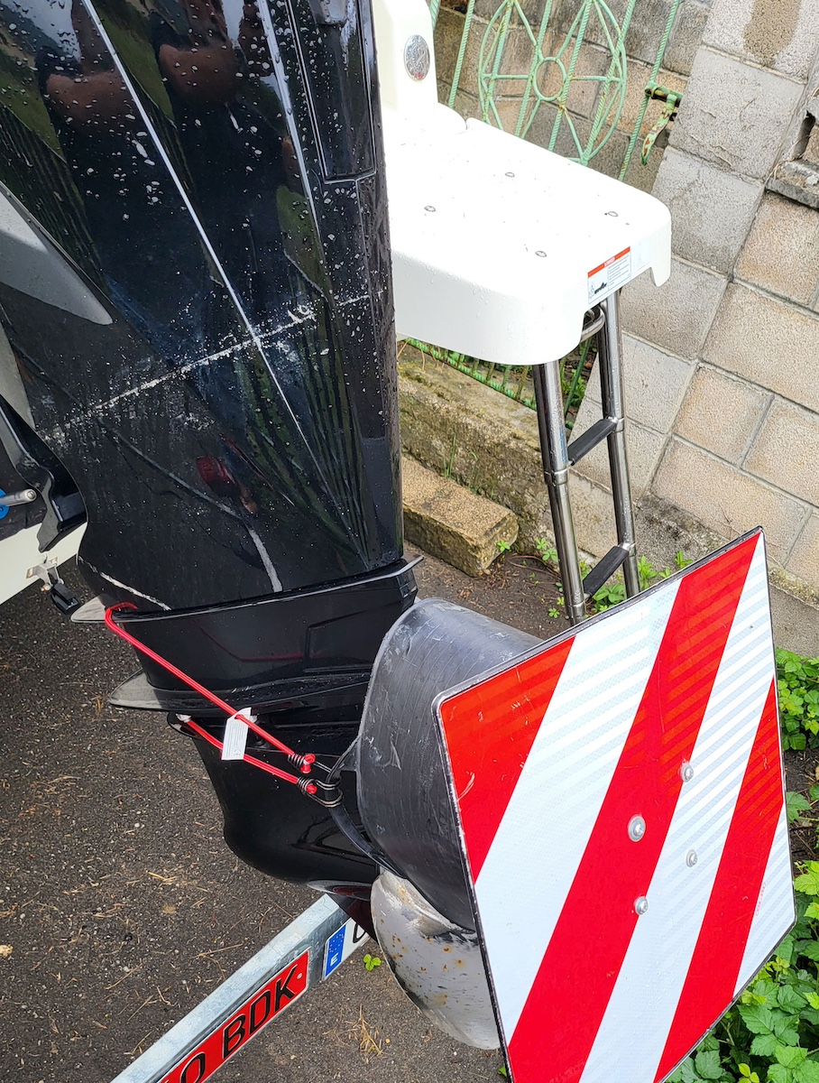 Según el artículo 15.3 del RGC, para el caso particular de un VW Touareg y la Quicksilver Active 705 Weekeng debería de instalar esta placa, ya que la cola del motor sobresale por detrás de la placa de matrícula, y podría hacerlo hasta un 15% del total del conjunto de vehículos, lo cual equivale a decir que la cola podría sobresalir por detrás de la placa de matrícula más de 180 cm… Aprovechando la coyuntura, puede desplazar la placa de matrícula hacia adelante (y no hacia atrás) lo máximo posible para que no roce en el suelo en los badenes y cuestas de gran pendiente. Pero recuerde que esto no ha de impedir el correcto visionado de las luces, matrícula, etc.