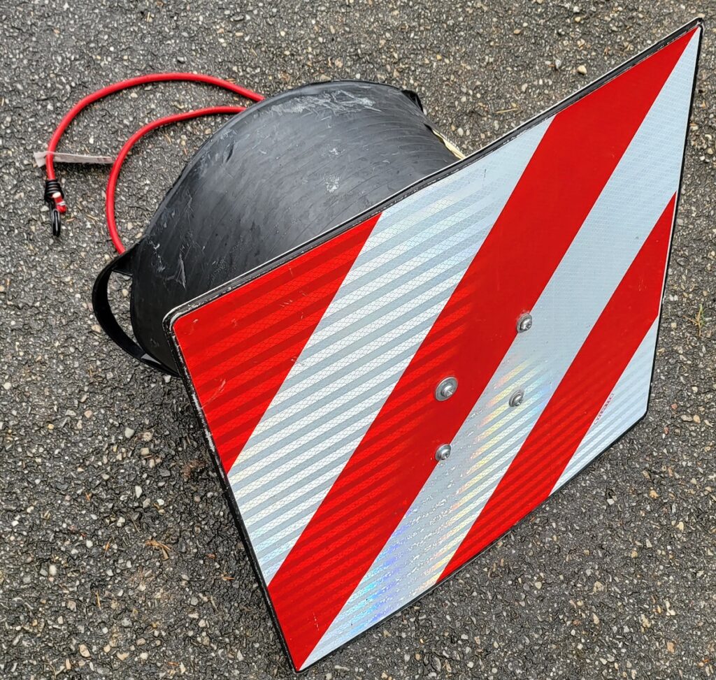 “En todo caso, la carga que sobresalga por detrás de los vehículos a que se refieren los apartados 2 y 3 deberá ser señalizada por medio de la señal V-20 a que se refiere el artículo 173 y cuyas características se establecen en el anexo XI del Reglamento General de Vehículos. Esta señal se deberá colocar en el extremo posterior de la carga de manera que quede constantemente perpendicular al eje del vehículo. Cuando la carga sobresalga longitudinalmente por toda la anchura de la parte posterior del vehículo, se colocarán transversalmente dos paneles de señalización, cada uno en un extremo de la carga o de la anchura del material que sobresalga. Ambos paneles deberán colocarse de tal manera que formen una geometría de «v» invertida”.