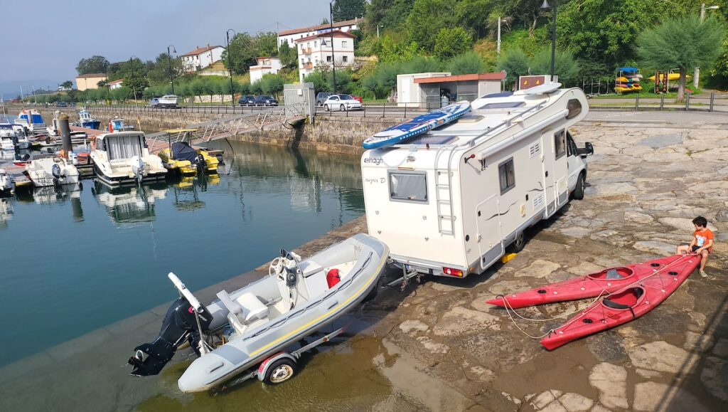Otro truco para saber el momento justo en que debemos parar en la marcha atrás al aproximar el barco a una rampa de botadura es girar el remolque hasta que veamos las ruedas por el espejo retrovisor. Yo siempre las dejo sumergidas por la mitad, y si giras el remolque en el último momento las ves por los espejos y no necesitas de nadie que te indique.