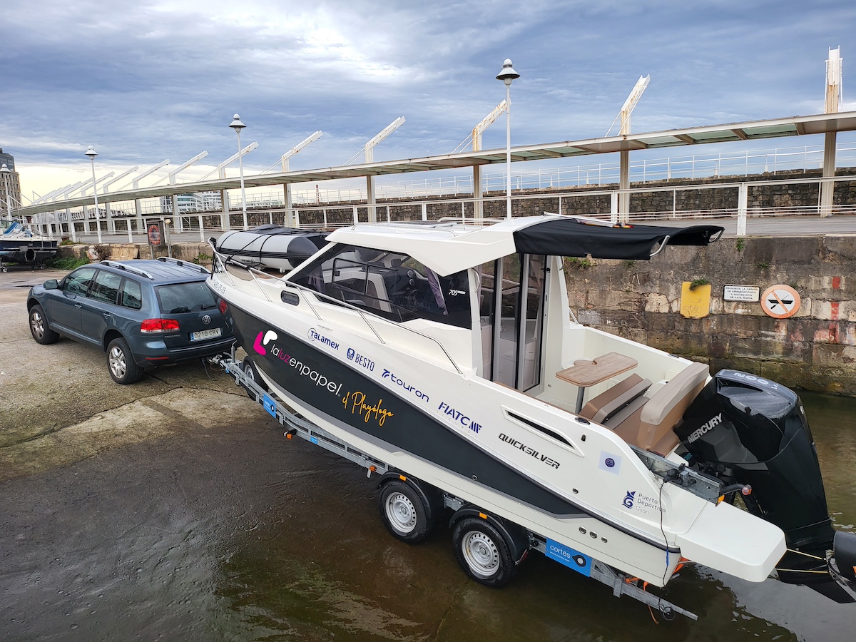 Un conjunto de vehículos grande, alto y voluminoso como nuestro remolque Brenderup y la Quicksilver 705 Active Weekendrequiere practicar mucho antes de hacer las maniobras y de conducir por carreteras estrechas. Pero en cuanto te haces a sus medidas ya sabes hasta dónde y por dónde te puedes meter. Les recordamos que el barco no puede exceder de los 2,55 m de manga, 12 m de largo y que la altura no puede exceder de los 4,20 m de puntal subido en el remolque.