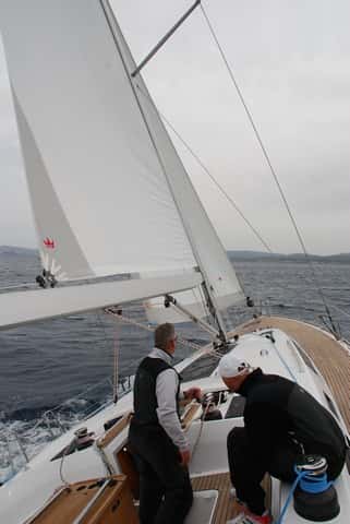 Con la driza bien tensa y el cabo del rizo cazado, volvemos a rumbo y trimamos la mayor cazando escota y contra si es necesario.
