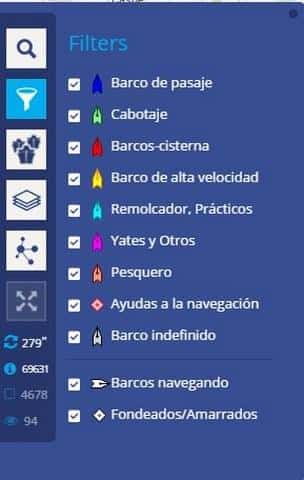 Para evitar tener demasiada información en la pantalla podemos filtrar la vista y hacer que nos presente sólo embarcaciones de un determinado tipo.