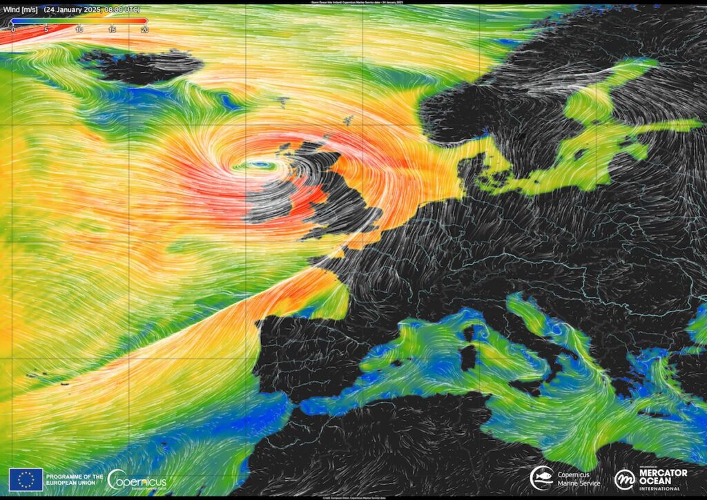 La borrasca Éowyn, que impactó en Europa el 24 de enero de 2025, fue la más potente del invierno 2024-2025. Afectó de forma especialmente severa a Irlanda, el Reino Unido, la isla de Man y algunas zonas de Escandinavia, dejando tras de sí daños generalizados, cortes masivos de suministro eléctrico y condiciones extremas tanto en tierra como en el mar.
