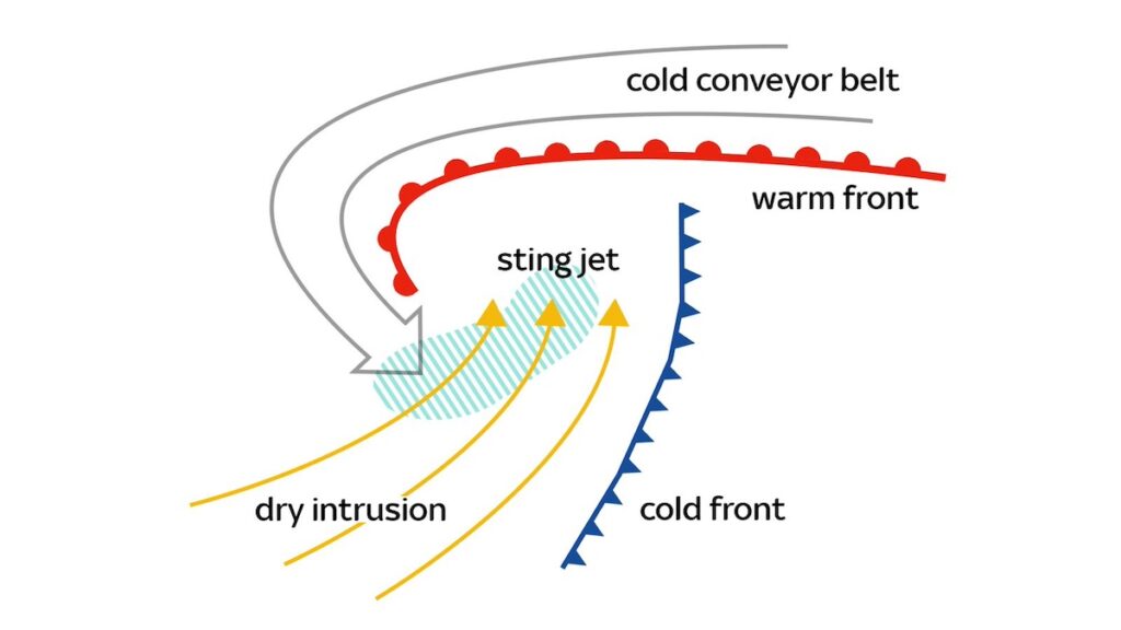 Como resultado, el aire frío cae de forma acelerada —similar a un vagón de montaña rusa en la bajada inicial— y genera ráfagas de viento extremadamente intensas al llegar a la superficie, mucho más fuertes de lo que produciría el sistema por sí solo. Este chorro concentrado de viento es lo que se conoce como sting jet.