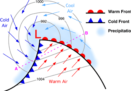 En la mayoría de borrascas (excepto las tropicales) existen frentes meteorológicos que separan masas de aire cálido y frío. La interacción entre ambos produce viento, lluvia, nieve e inestabilidad.