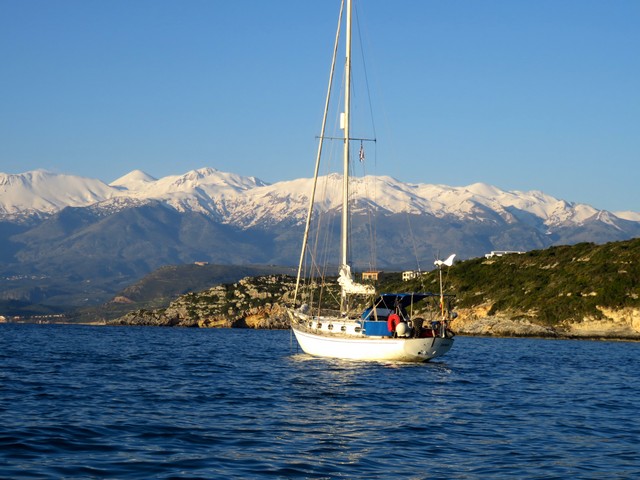 De camino hacia poniente el fondeadero de Marathi, a la entrada del golfo de Souda, es un sitio espectacular y bien protegido excepto con SE, con unas vistas espectaculares sobre las Montañas Blancas, el macizo que domina la parte occidental de la isla, una especie de laberinto de tres docenas de cumbres de más de 2.000 metros culminadas por un pico de 2.450 metros.