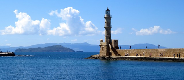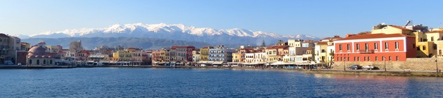 Al pie ya de las Montañas Blancas, en la zona más occidental de la isla, nos acoge el puerto de Chaniá, la ciudad que mejor representa el largo periodo en que la isla estuvo bajo la dominación veneciana. La entrada al puerto, dejando por babor el faro veneciano y enfilando la dársena en la que aún se conservan las atarazanas venecianas, ofrece una imagen muy evocadora con un telón de fondo espectacular formado por el gran macizo montañoso que hace honor a su nombre al estar cubierto por una gruesa capa de nieve en plena primavera.