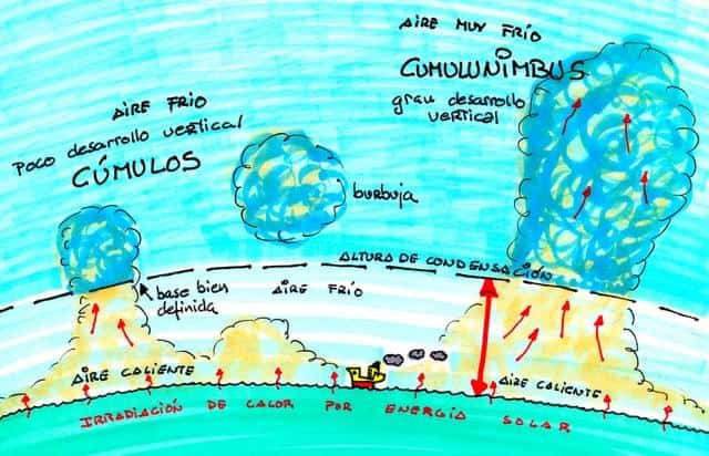 Imaginemos una masa fría de aire por la mañana sobre la superficie terrestre. Con el paso de las horas el sol calienta la superficie, por lo que la capa de aire en contacto con ella experimenta un aumento de temperatura. El aire caliente es menos denso que el frío, y se eleva en su seno, produciéndose unas burbujas y corrientes de aire ascendente. Al ir subiendo estas burbujas se enfrían, y al llegar a una cierta altura las condiciones de presión y temperatura desencadenarán el proceso de condensación. Esta altura es la denominada altura de condensación, a partir de la cual la masa de aire ascendente se transforma en nube. Cuando son burbujas desprendidas se forman los cúmulos de buen tiempo, pero si se trata de una corriente continua ascendente estos cúmulos evolucionan hasta cumulonimbos, pues al no cortarse la alimentación de aire caliente éste sube ininterrumpidamente hasta que la nube se desmorona pues la corriente ascendente no puede soportar el peso del agua acumulada (chubasco).