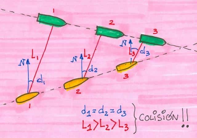 Cuando dos buques navegan con riesgo de colisión es básico ir tomando demoras al otro barco. Si la demora es constante y la distancia disminuye la colisión está garantizada. Para evitar el accidente será necesario variar la velocidad o el rumbo para que la demora no se mantenga constante. Al variar la demora se evita la colisión.