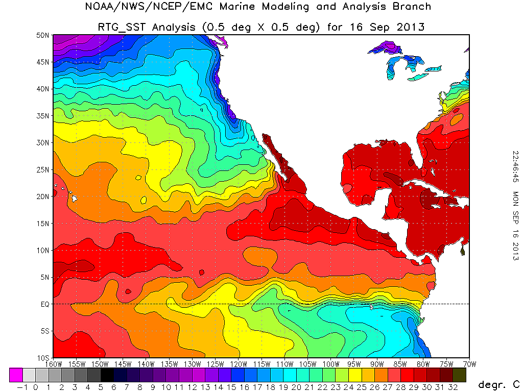 El mar en Chile y Perú puede ser hasta 10ºC más frío o incluso más que otras zonas del Pacífico. Esta diferencia se puede ver en el mapa de temperaturas superficiales de la NOAA que muestran el contraste entre las aguas de la corriente de Humboldt al sur del ecuador (temperatura de unos 15°C) con las aguas de la propia corriente ecuatorial del norte, mucho más cálidas (casi 30°C).