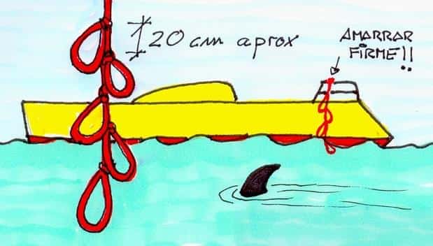 Si por alguna razón perdiera la escala o su barco no dispone de tan simple artilugio, siempre podrá construir una escala de respeto con un cabo, así no tendrá por que negarse ante esos placenteros chapuzones. Sencillamente arme una serie de gazas consecutivas y separadas unos dos palmos mal medidos para usarlas de escalón. Eso sí, amarre fuertemente un extremo al barco, si no será inútil todo el trabajo. Reconozco que este tipo de escala es molesta de usar, y el cabo duele un poco en la planta de los pies, pero verá como conseguirá subir a cubierta.