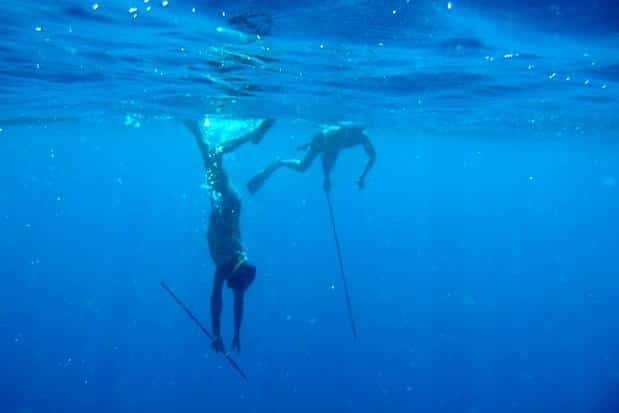 Tenemos la suerte de que los pescadores del poblado acepten que los acompañemos en su próxima salida de pesca. Mientras ellos realizan su tarea de pescar langostas a profundidades de 20 metros, a pulmón libre, nosotros los acompañaremos con botellas de buceo. La experiencia es espectacular, pues demuestran una gran potencia física, bajando sin parar y pescando langostas y pescados con unos utensilios muy rudimentarios.