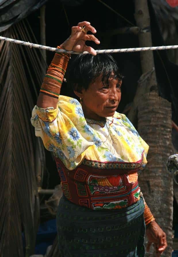 Las mujeres se pintan de rojo las mejillas y muchas llevan una argolla en la nariz. Se cubren las extremidades con llamativas pulseras y tobilleras, y visten un traje tradicional llamado “mola”, que es una pieza de ropa ajustada al cuerpo como si fuera un corsé, con diseños basados en plantas y animales de su entorno.