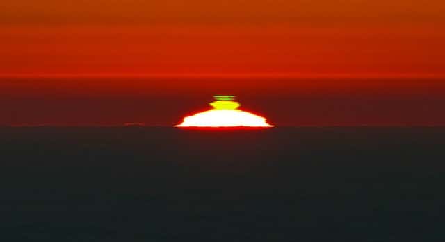 Al ponerse el sol, el pequeño segmento del disco solar que resta antes de desaparecer se puede volver de color verde esmeralda o verde azulado en el último momento. Este fenómeno óptico se debe a la desigual refracción de los diferentes colores que forman la luz blanca.