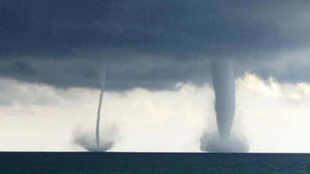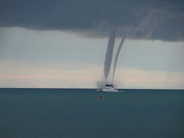 Antes de entrar en contacto con el agua se forma en la superficie un torbellino giratorio que eleva el agua de mar unos metros en forma de cono que acaba uniéndose con el de la nube. No suelen durar mucho rato, entre diez minutos y media hora, y al ser los vientos de gran violencia pueden originar mar gruesa a su alrededor y en el vórtice, donde evidentemente se produce una succión, todo ello de gran peligro, sobre todo para las embarcaciones menores.
