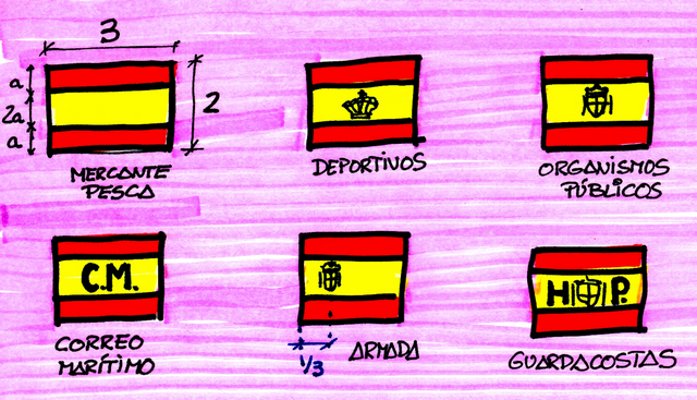 Los barcos mercantes izarán un pabellón sin ningún escudo, a excepción del buque correo que llevará las letras CM (correo marítimo) en azul marino en medio de la franja amarilla. Los barcos de pesca izarán el mismo pabellón que los mercantes. Las embarcaciones deportivas izarán el mismo pabellón que los mercantes pero con la corona imperial en azul marino en el centro de la franja amarilla. Los buques de guerra izarán el pabellón nacional con el escudo constitucional en azul marino en la franja amarilla a una distancia de un tercio del costado del mástil, siendo el escudo tangente a las franjas rojas. Los guardacostas izarán el pabellón con el escudo constitucional en azul marino centrado en la franja amarilla flanqueado con las letras HP (hacienda pública).