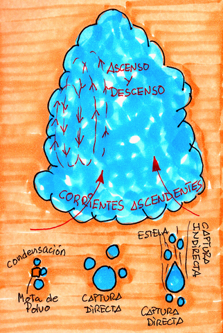 El descenso de temperatura en una masa de aire cálido ascendente comporta la saturación del vapor de agua suspendido formándose minúsculas gotitas de agua. Si las condiciones atmosféricas son óptimas la masa de aire caliente y húmedo continúa su viaje ascendente, y las pequeñas gotas de agua se empiezan a helar.
