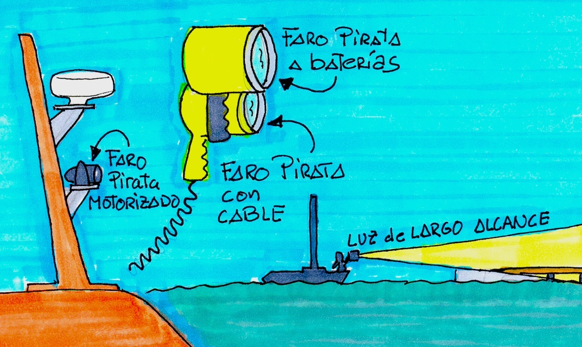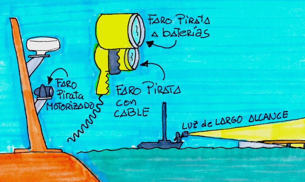 Se denomina “faro pirata” a una potente luz exterior montada sobre una base y accionada manualmente o mediante control remoto, con el fin de observar con la máxima claridad posible en la lejanía cuando no existe visibilidad.