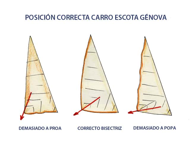 Bien, navegando de ceñida hemos cazado las escotas para que la vela no flamee. En el caso del génova es importante que el carro de escota del mismo esté colocado correctamente, en lo que haría que la escota salga del mismo en una bisectriz de la baluma y el pujamen del génova o foque.