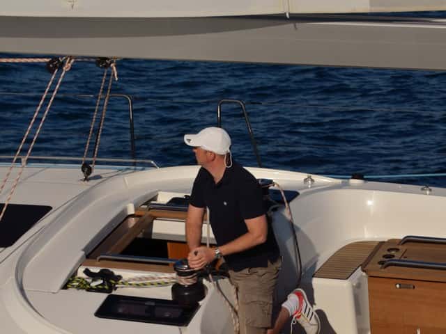 Una vez cazadas las dos velas, con los carros en su posición correcta, el velero adoptará una ligera escora y comenzará a navegar en un ángulo de unos cuarenta grados contra el viento. El timonel tiene que notar un timón suave que no le tire mucho, tan sólo percibirá que el barco es un poco “ardiente”, es decir, que tendrá tendencia a llevar la proa hacia el viento (orzar), hecho que corregirá con el timón ligeramente metido para compensar este efecto.