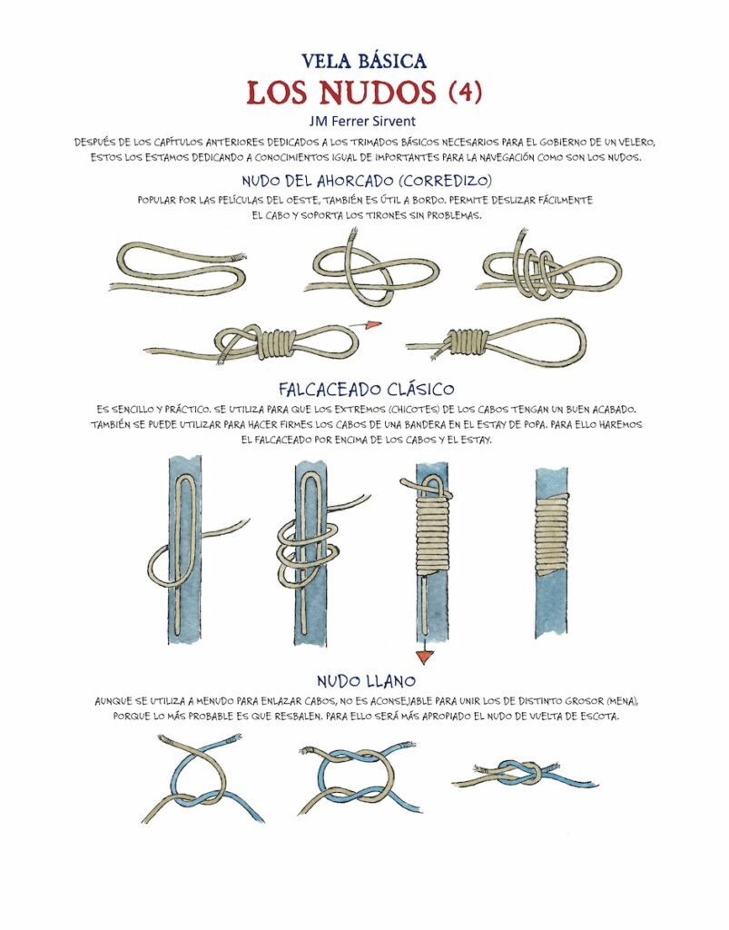 Seguimos con la cuarta serie de ilustraciones de JM Ferrer Sirvent dedicada a los diferentes nudos náuticos. En esta ocasión, podéis aprender el nudo del ahorcado (corredizo), el falcaceado clásico y no menos importante, el nudo llano.