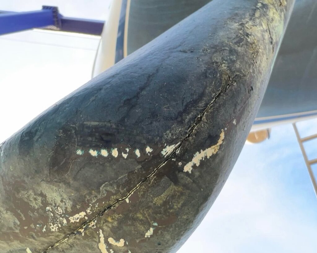 Este tipo de defecto debe tomarse con precaución, ya que, dependiendo del avance de las grietas, la pala del timón puede fallar por completo dejando la embarcación sin medios de gobierno.