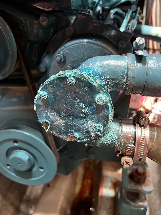 Las fugas de agua salada de refrigeración suelen ser otro clásico de la problemática de los motores marinos. El agua salada es muy corrosiva y los elementos sensibles como la tapa del impulsor de agua de refrigeración, el intercambiador o el codo de escape pueden incluso sufrir daños por la acción del agua salada. En el caso de los codos de escape, la oxidación suele empezar en las paredes interiores del material y no siempre es fácil de detectar.