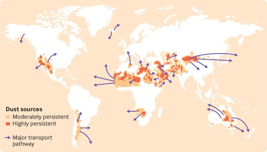 Otras fuentes de polvo son los desiertos y semidesiertos que se extienden desde el Sahara pasando por Oriente Medio, Asia Central hasta el desierto de Gobi de China y Mongolia. Esta banda del planeta es conocida como el “cinturón de polvo”.