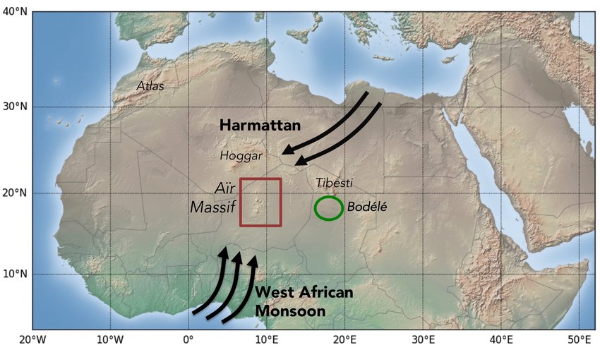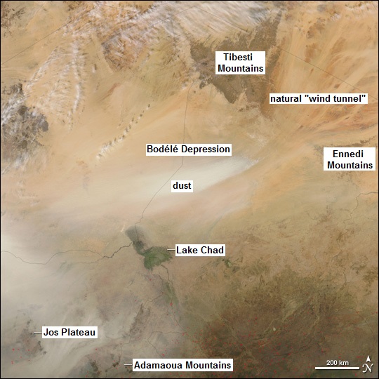 Cuando sopla el viento del nordeste, el Harmattan, atraviesa las montañas de Tibesti y la meseta de Ennedi en el norte de Chad, y es canalizado hacia la depresión de Bodele. En la imagen del desierto podemos ver la posición de las montañas y como el viento levanta una nube de polvo en la depresión.