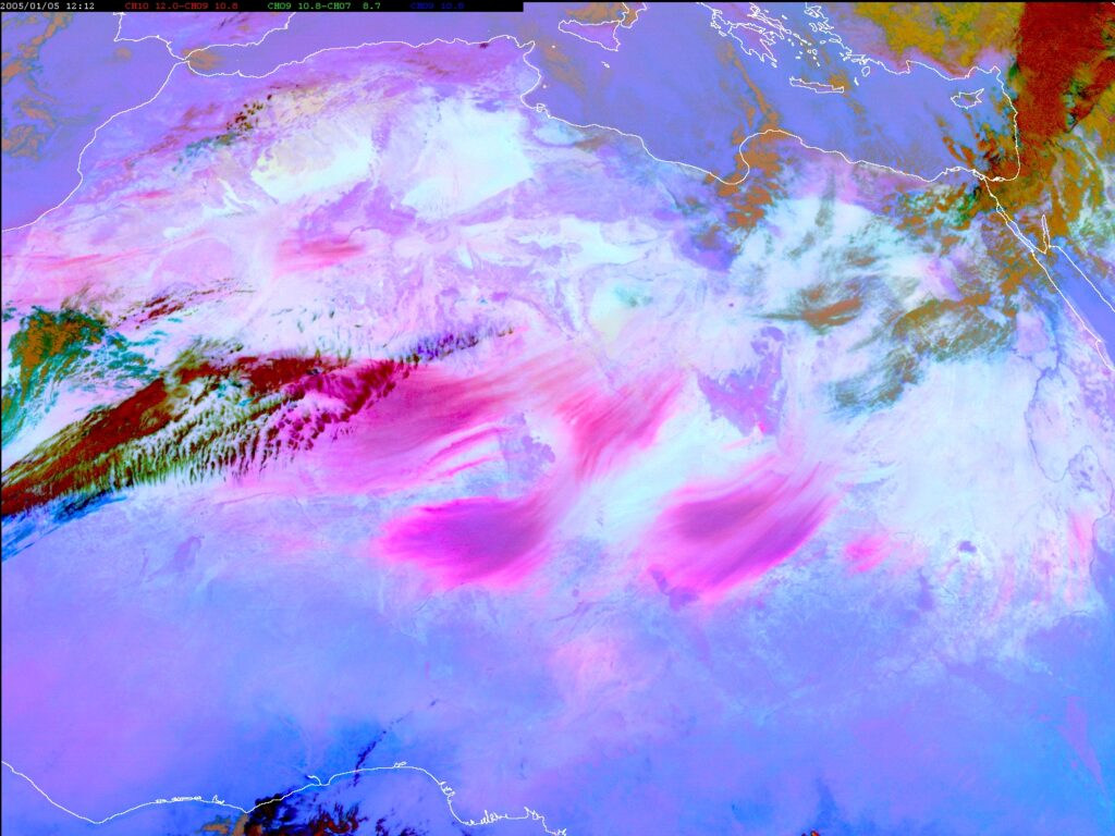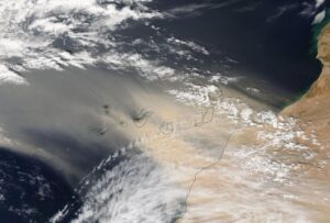 En esta región, seca, árida, vacía de vegetación, se transfieren desde el suelo a la atmósfera grandes cantidades de partículas de pequeña dimensión, como carbonatos, arcillas, cuarzo, óxidos de hierro y manganeso en función del tipo de superficie. Este “polvo” puede ser transportado a lugares muy lejanos, por ejemplo a la Península Ibérica cuando soplan fuertes vientos del sur o al Amazonas.
